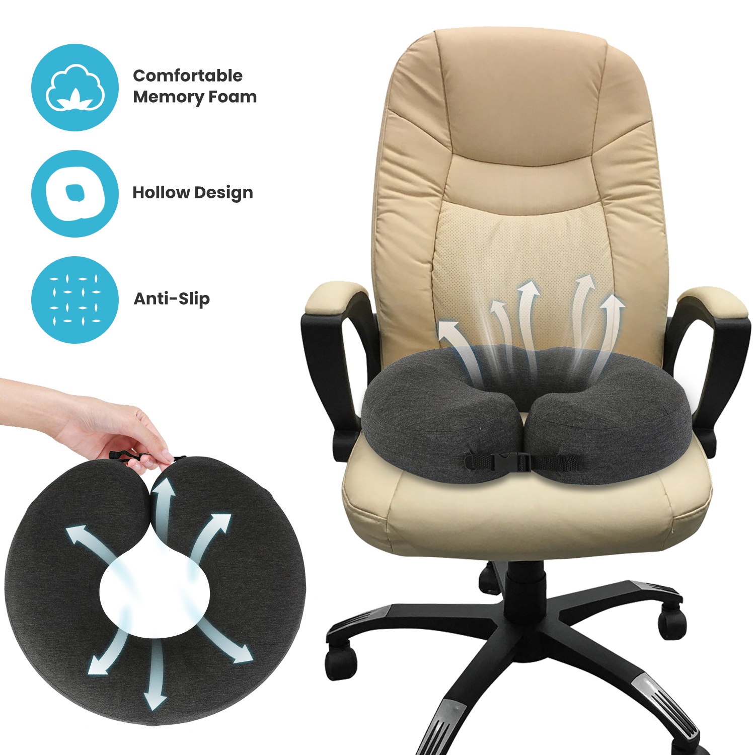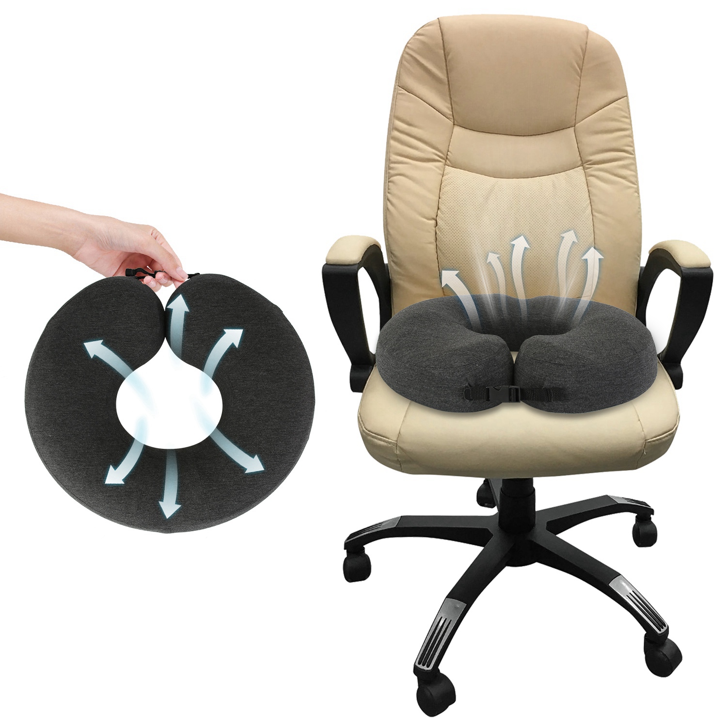 Our donut-design seat cushion filled in 3.94in-thickness space slow-rebound memory foam, with middle hollow design and front and back curved slots, is great for provide ergonomic support for your buttocks and thighs while ensure excellent breathability and reduce body weight pressure. The cushion with size of 17.32x15.35in(LxW) is suitable for most chairs, like office chair, armchair, couches, wheelchair, car seat, etc.. It's a perfect gift for those have long sitting time and driving time and who suffer from sciatica, herniated.