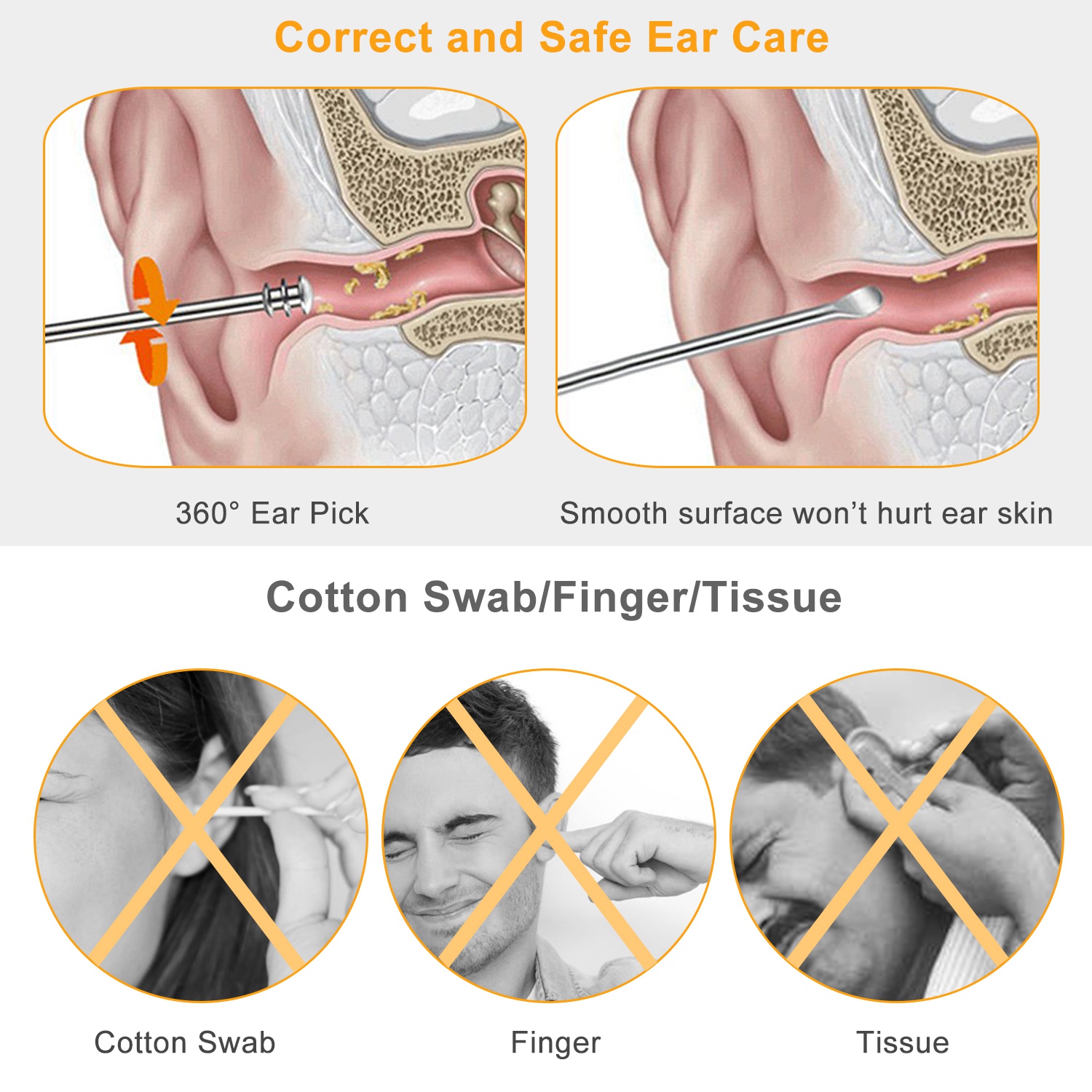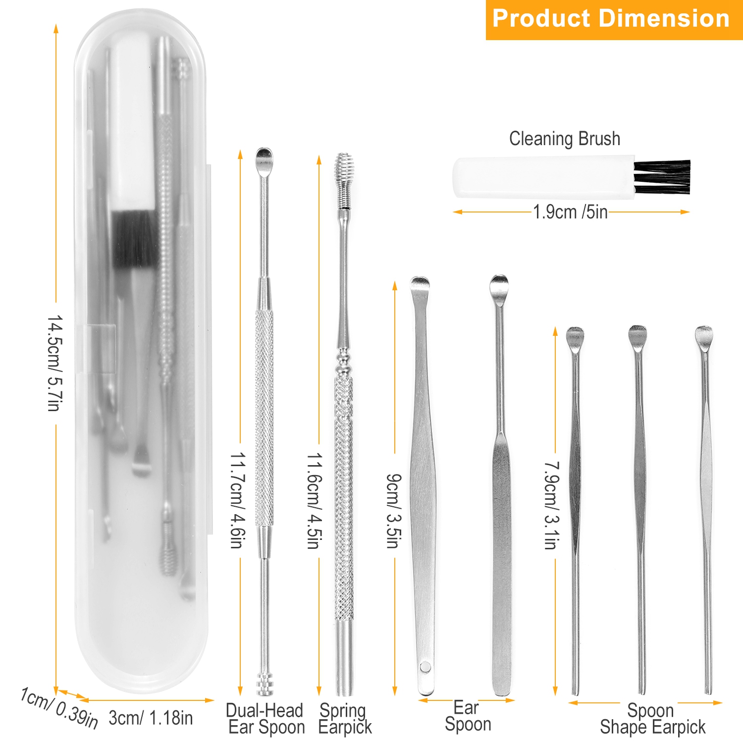 Unlike cotton swabs and tissues which may further push ear wax into the ear, our 8pcs earpick tool set can effectively remove earwax. We adopts medical-grade stainless steel to offer professional ear care for you, safe to use and easy to clean. This tool set contains 5 spoon shape earpicks, 1 spring earpick, 1 dual-head ear spoon and 1 cleaning brush, which will help you to massage ear canal and relieve itching while cleaning. The ergonomic and textured anti-slip handle design is to help you better control the pressure during use. Moreover, comes with a plastic storage box makes them well-kept and easy to carry while traveling.