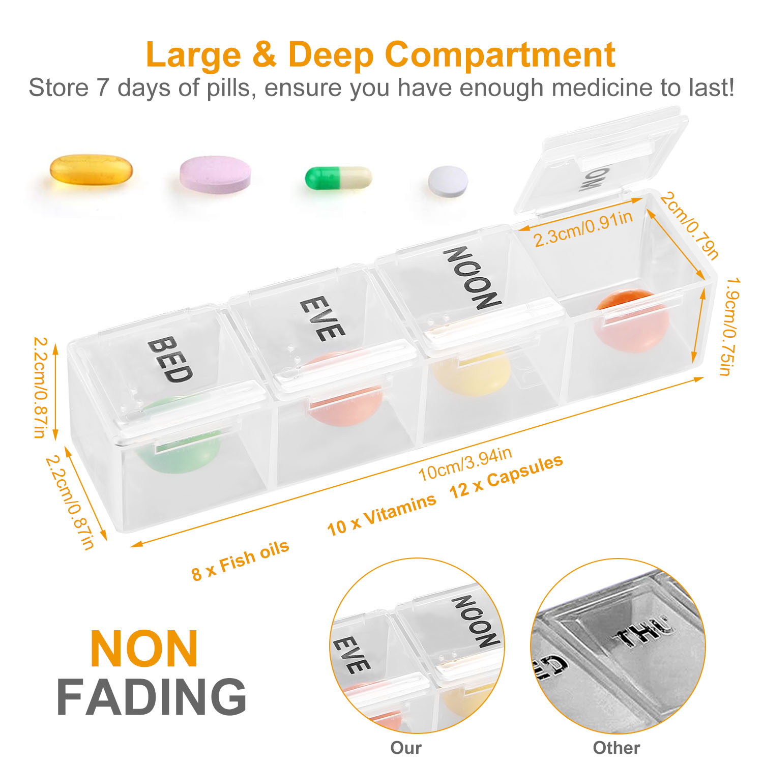 Our weekly pill organizer features lightweight and portable, which make it good for easy carrying during traveling, business trip or any outdoor activities. There are 28 separate compartments constructed with BPA-free material, and clearly visible lid, which help remind you to take medicine accordingly. It can store 7 days of pills at once and ensure you have more than enough medicine to last during your traveling, business trip, outdoors, etc. Moreover, our weekly pill organizer features moisture-proof, which can keep vitamins, medication or supplements safe from damaging moisture and oxidation.