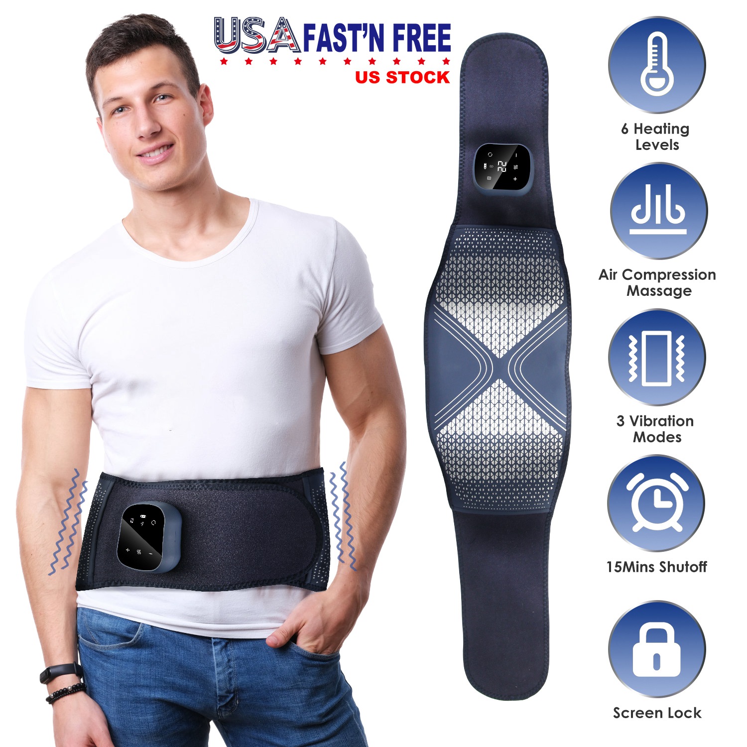 This cordless heating pad delivers an all-in-one massage experience, with 6 heating levels, 3 air compression massage modes, 3 air compression intensity levels and 3 vibration modes, able to provide soothing warmth and comfort to our lower back, waist, belly, shoulder, knee and legs. Fast heat up for 3S, support screen lock, auto shut off for 15 minutes for safety. Fit for all waists. Cordless and USB rechargeable, easy to carry everywhere. Digital display, easy to read and use. An ideal gift for our mother, father, lover and colleague etc..